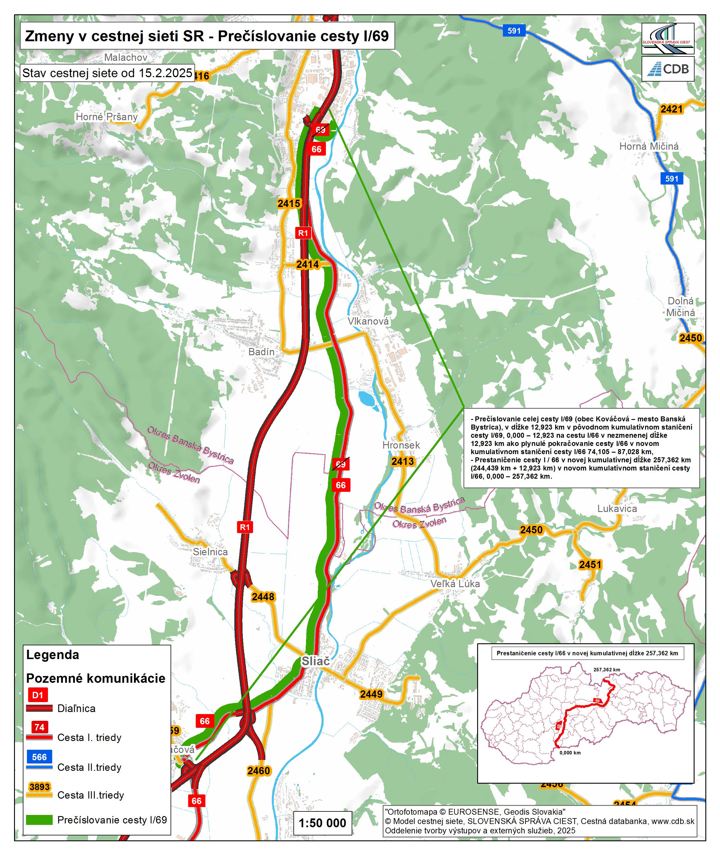 Prečíslovanie celej cesty I / 69 (obec Kováčová – mesto Banská Bystrica), v dĺžke 12,923 km v pôvodnom kumulatívnom staničení cesty I / 69 , 0,000 – 12,923 na cestu I / 66 v nezmenenej dĺžke 12,923 km ako plynulé pokračovanie cesty I / 66 v novom kumulatívnom staničení cesty I / 66 74,105 – 87,028 km. Prestaničenie cesty I / 66 v novej kumulatívnej dĺžke 257,362 km (244,439 km + 12,923 km) v novom kumulatívnom staničení cesty I / 66, 0,000 – 257,362 km. – 15.2.2025